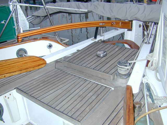 The cockpit, looking aft The cockpit footwell is in the lower left; it's larger than it looks, because the aft half is filled by a locker, containing the main propane cylinder for the stove. (You can see the outline of the footwell continuing around the lid.) On the lower-right, the steel cylinder is the top for the diesel fill pipe. Above it is the mainsheet winch, and above it is the lid of the aft deck locker. The tiller comes right across the cockpit; you can see where it's set into the top of the rudder, which is mounted externally on the stern. The gray cover is for the folded-up bimini, a sun roof that comes over the whole cockpit.