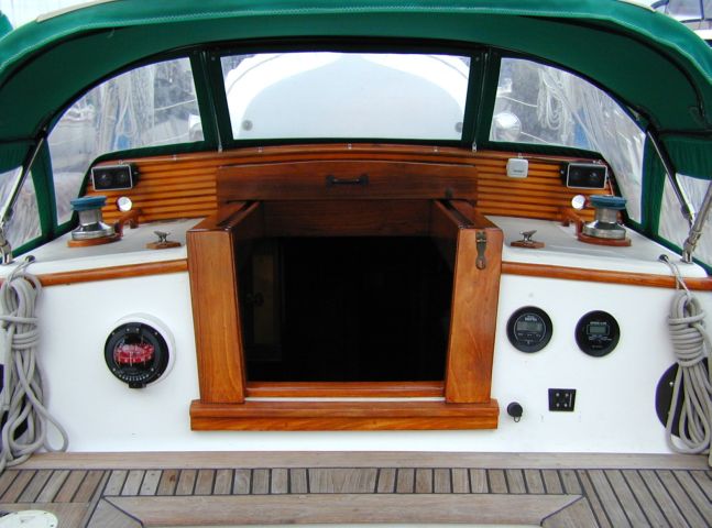 The cockpit Looking forward under the dodger (spray guard). The companionway is in the centre; to the left is the compass, and on the right are the depth gauge and knot meter. Below them is the bracket for the autopilot control unit, and its power socket on the left. Up above are the staysail sheet winches on either side; behind them are the outside speakers for the hi-fi, with an extension speaker for the marine VHF to the left of the right speaker. Through the dodger windows you can see the dinghy, which obscures the view somewhat, but you don't really sit in the centre.