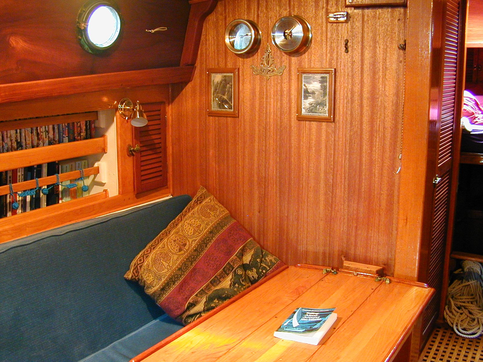 Port side of the salon, looking forward My clock and barometer on the wall; a couple of shelves of books behind. The neat little lamp on the wall is a halogen, and gives tons of light for reading (there's a ceiling light above). The book, by the way, is "Sailing Alone Around the World", by Captain Joshua Slocum, 1900.