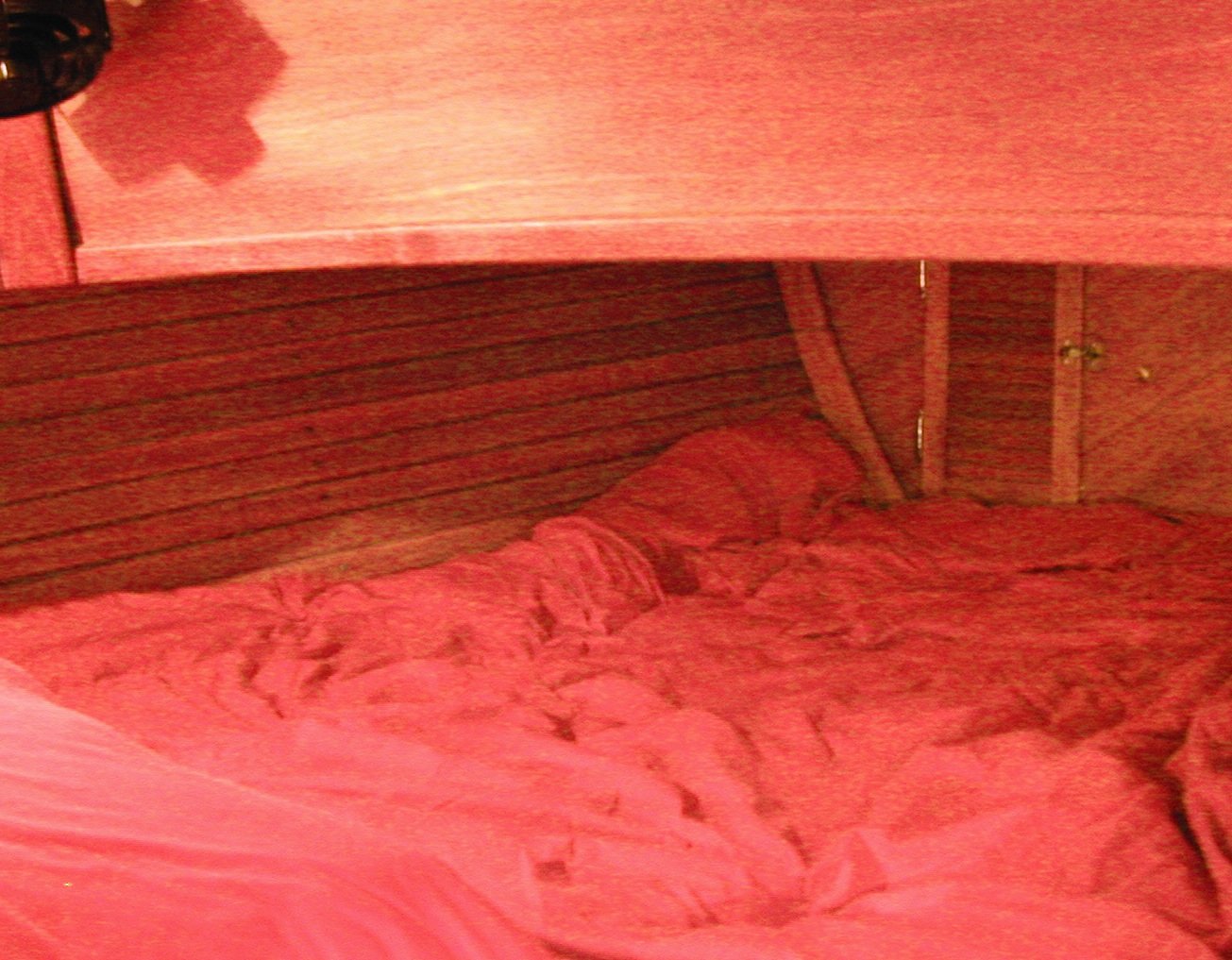 The stateroom, looking forward The main berth, with lockers on the right; the doors forward lead into the chain locker (where the anchor chain is stored).