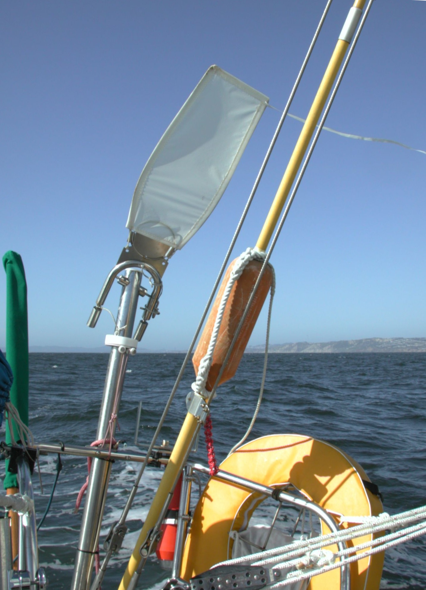 The Cape Horn windvane This is the wind-powered autpilot. It uses an auxilliary rudder to generate power to move the tiller, guided by the windvane, to keep the boat at a constant angle to the wind. And it works great! Sailing to Pillar Point
