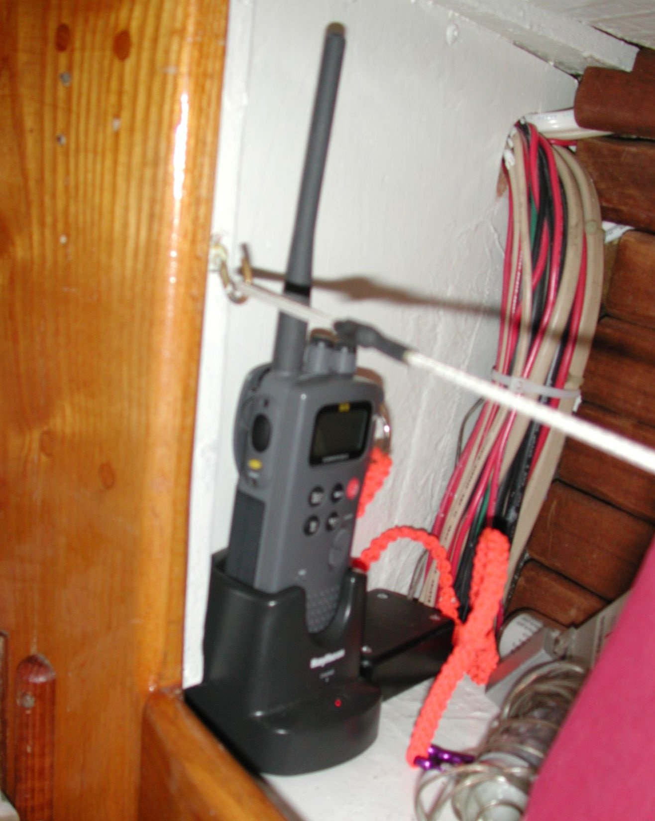 Charging station Charging station for the hand-held radio. The charger is fixed in place behind the nav station; there's a switch on the little black box beside it, and it's wired into the outlets circuit.
