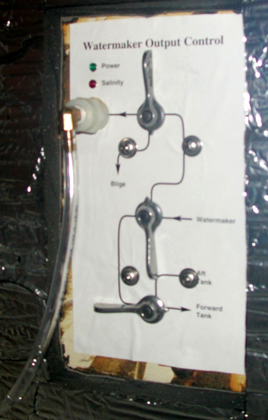 The watermaker control panel The watermaker control panel, as seen from the quarter-berth. The LEDs to the top-left are power and salinity. Below is the test spigot, which has a ΒΌ" barb to allow a hose to be attached.