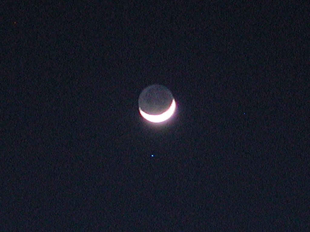 The moon before leaving. The crescent Moon, with the "dark" half illuminated by Earthshine, just after Sunset. The night before leaving.