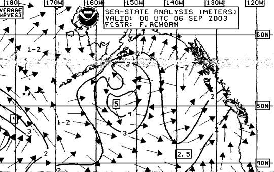 Sample weatherfax -- part of a sea state analysis fax. This shows wave heights in the Pacific south of Alaska, with Vancouver Island at the right.