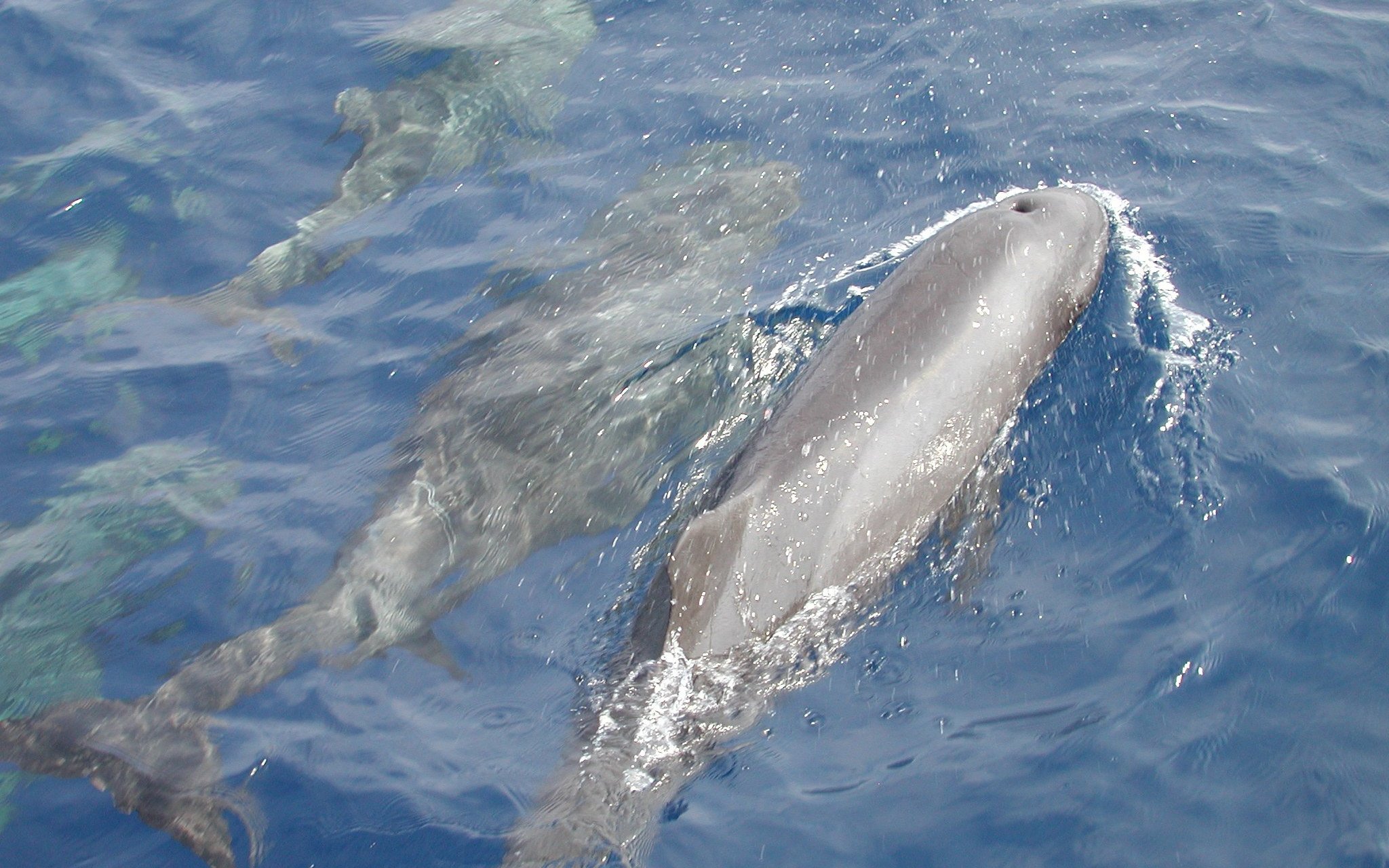 Dolphin blowing. Three dolphins, one in the act of taking a breath; the water is beautifully clear.