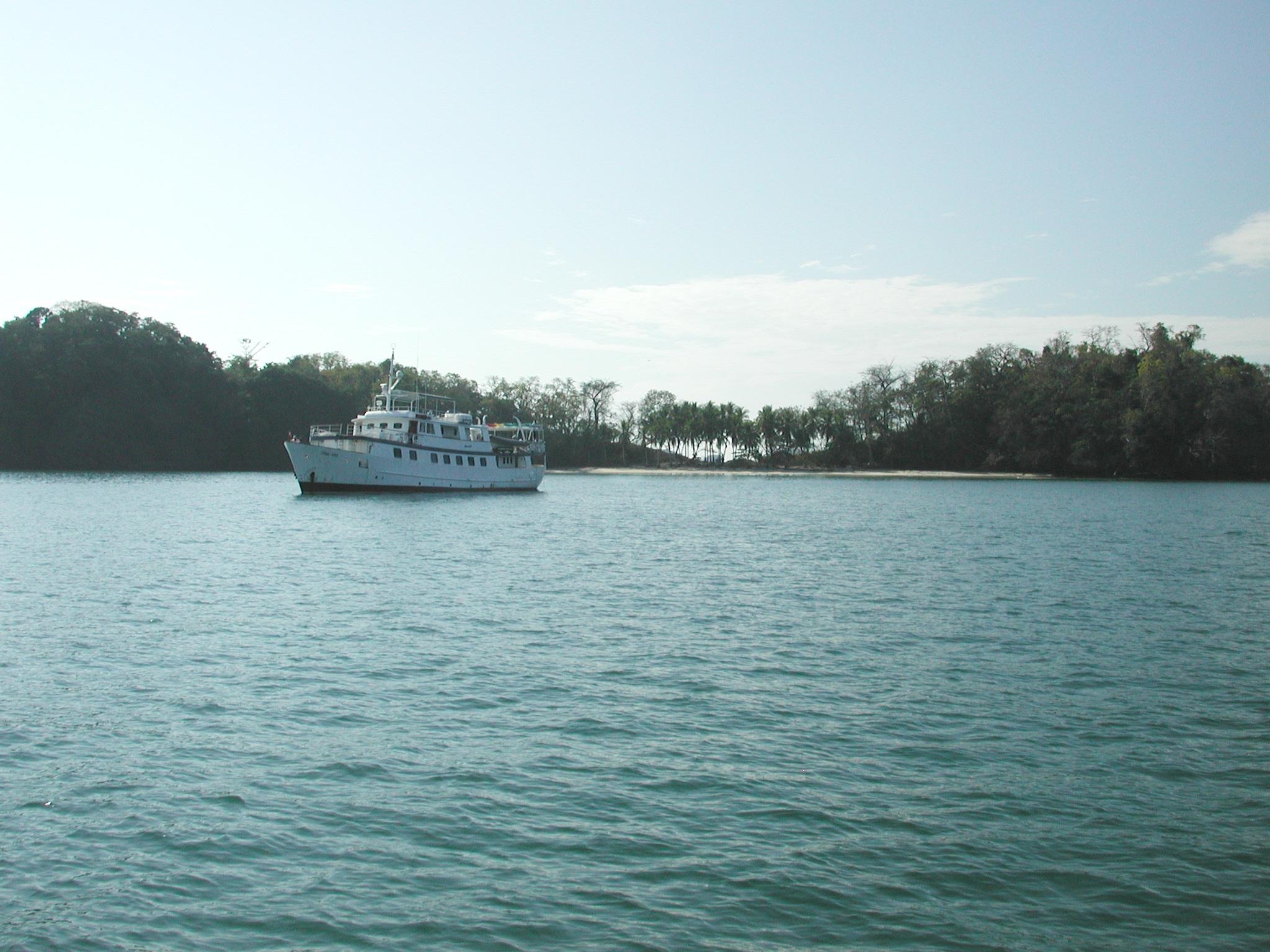 Coral Star and Isla Gamez. Coral star, Panamanian-registered, was anchored here when we arrived. We later went kayaked to Isla Gamez, landing on the far side of the island, and walked over to the beach in this picture for some swimming.
