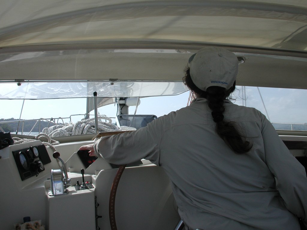 Practice transit: Rachel at the push-button helm. Rachel taking a turn at the steering. The autopilot is the same make as our own, with the same basic controls, although it's a lot more powerful as befits a larger boat.