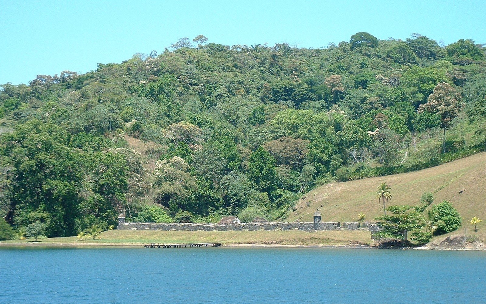 The lower fort from the water. Rowing over from Moonrise to the fort on the north side of Portobelo bay; the upper fort is to the right, and the keep is at the summit of the hill behind it.