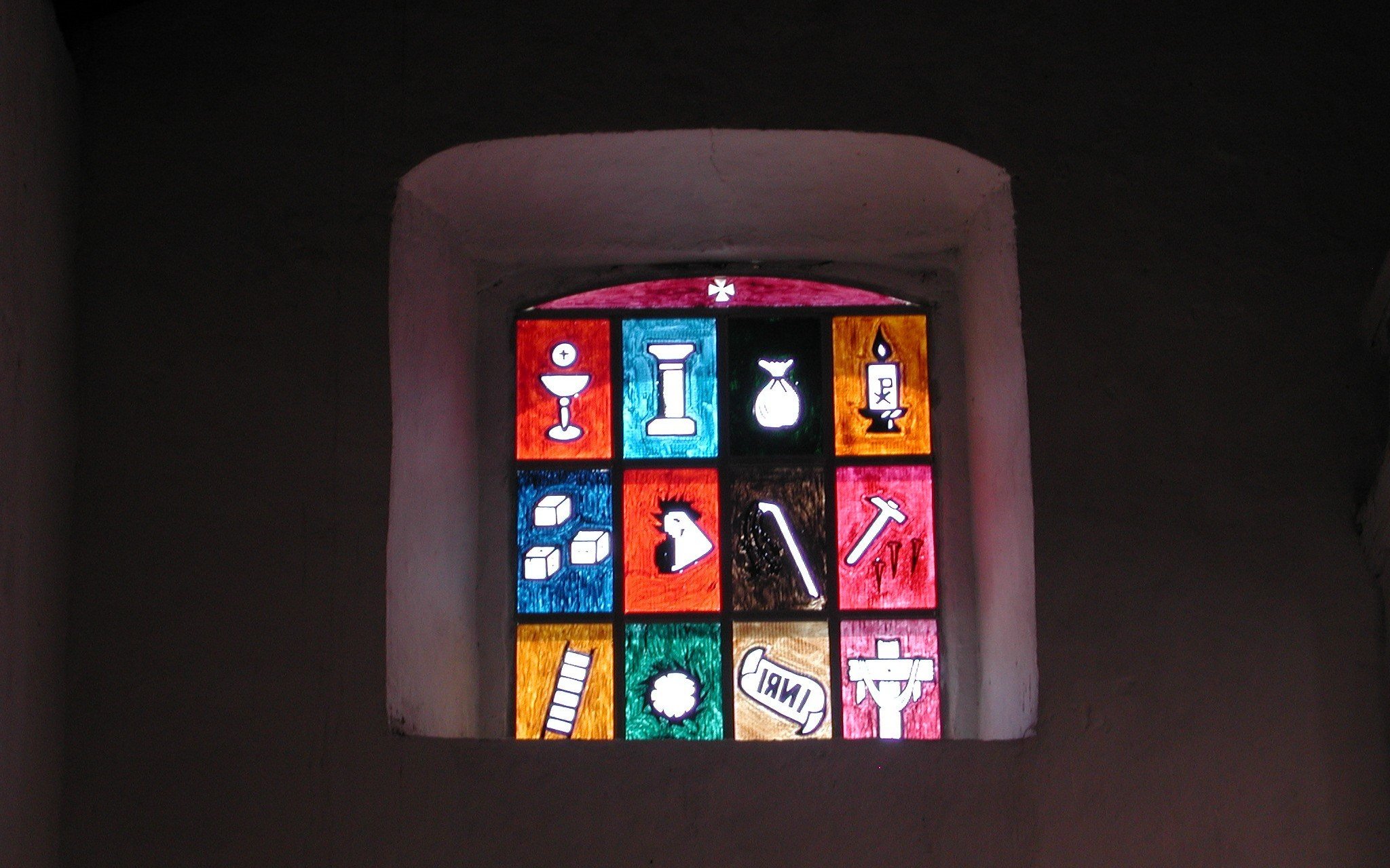 Stained-glass window in the church. Note that this is the reverse view. I'm not sure what all the symbols mean, though they are repeated behind the altar.