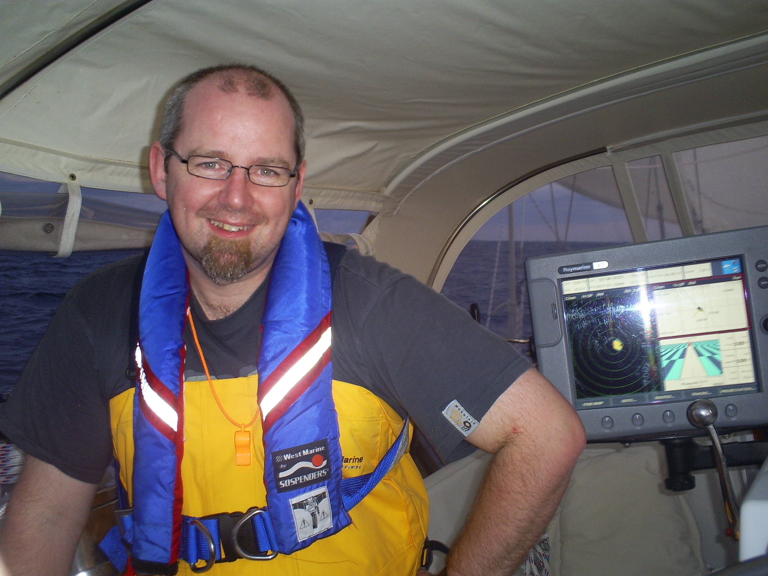 Ian in foulie bibs; by Matt.