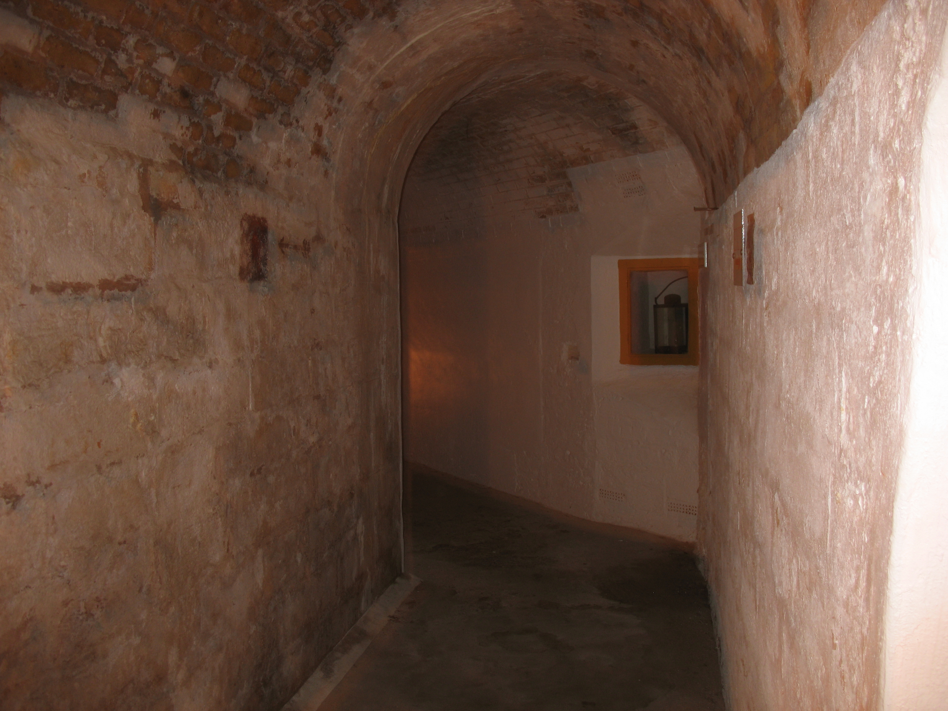 Dungeons -- actually the old magazine, under Fort St. Catherine. The light box in the wall was for an oil lamp, separated from the magazine tunnels by a sealed glass window, and tended from a separate tunnel behind.