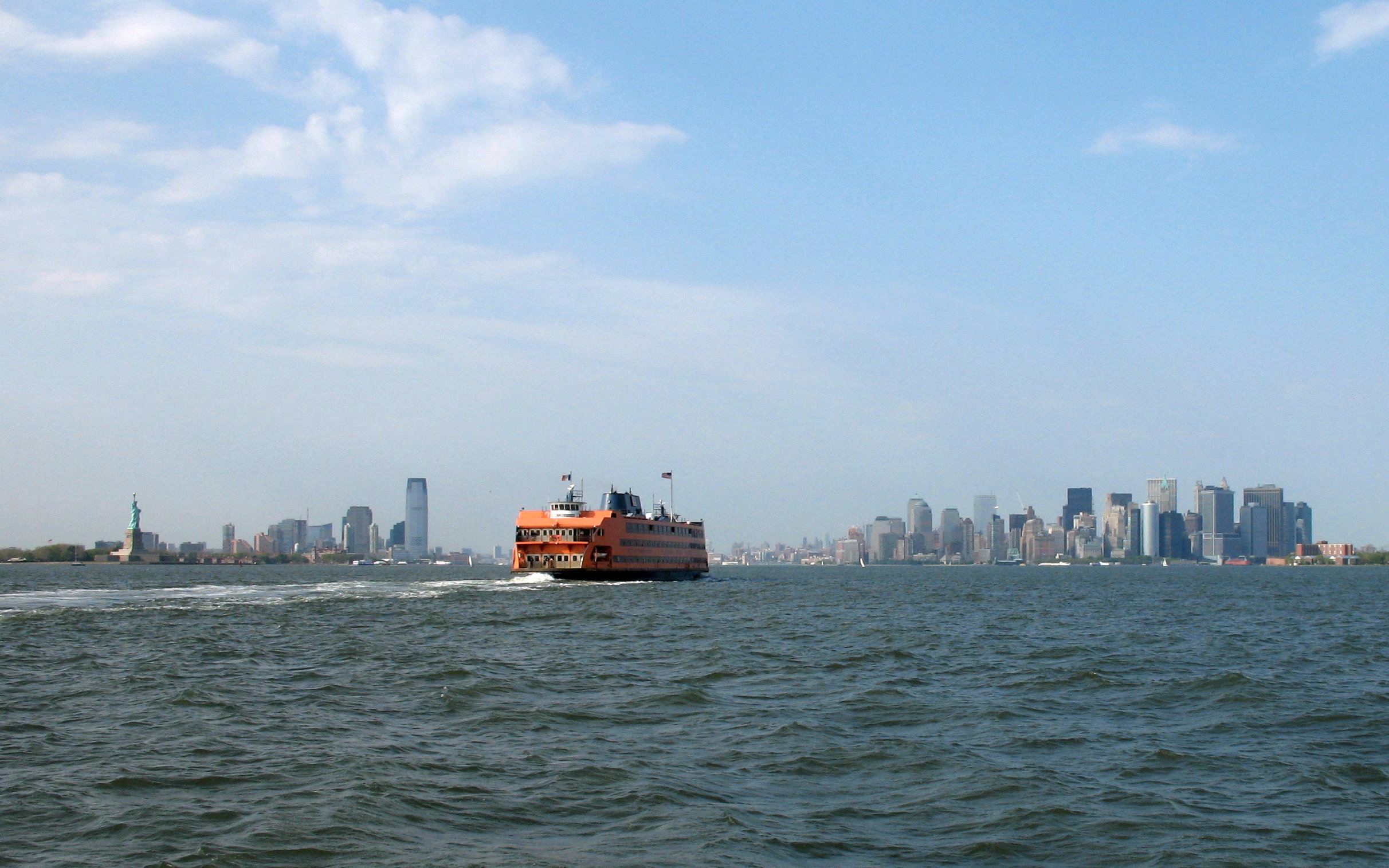 New York Harbor. The Statue of Liberty, Jersey City, the Staten Island Ferry, and Manhattan.