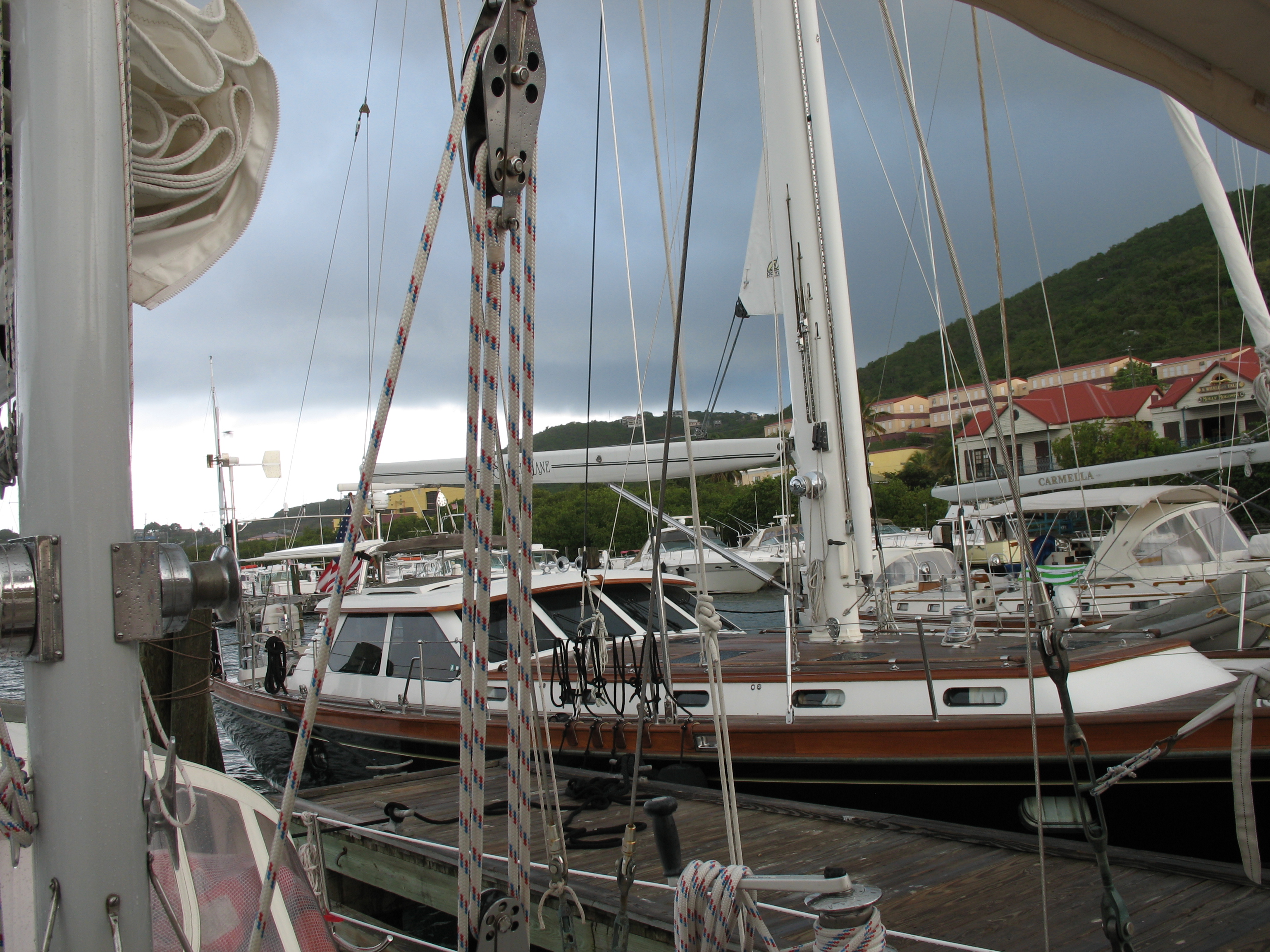 A neighouring boat in St. Thomas, and dark clouds looming overhead. It poured with rain all morning.