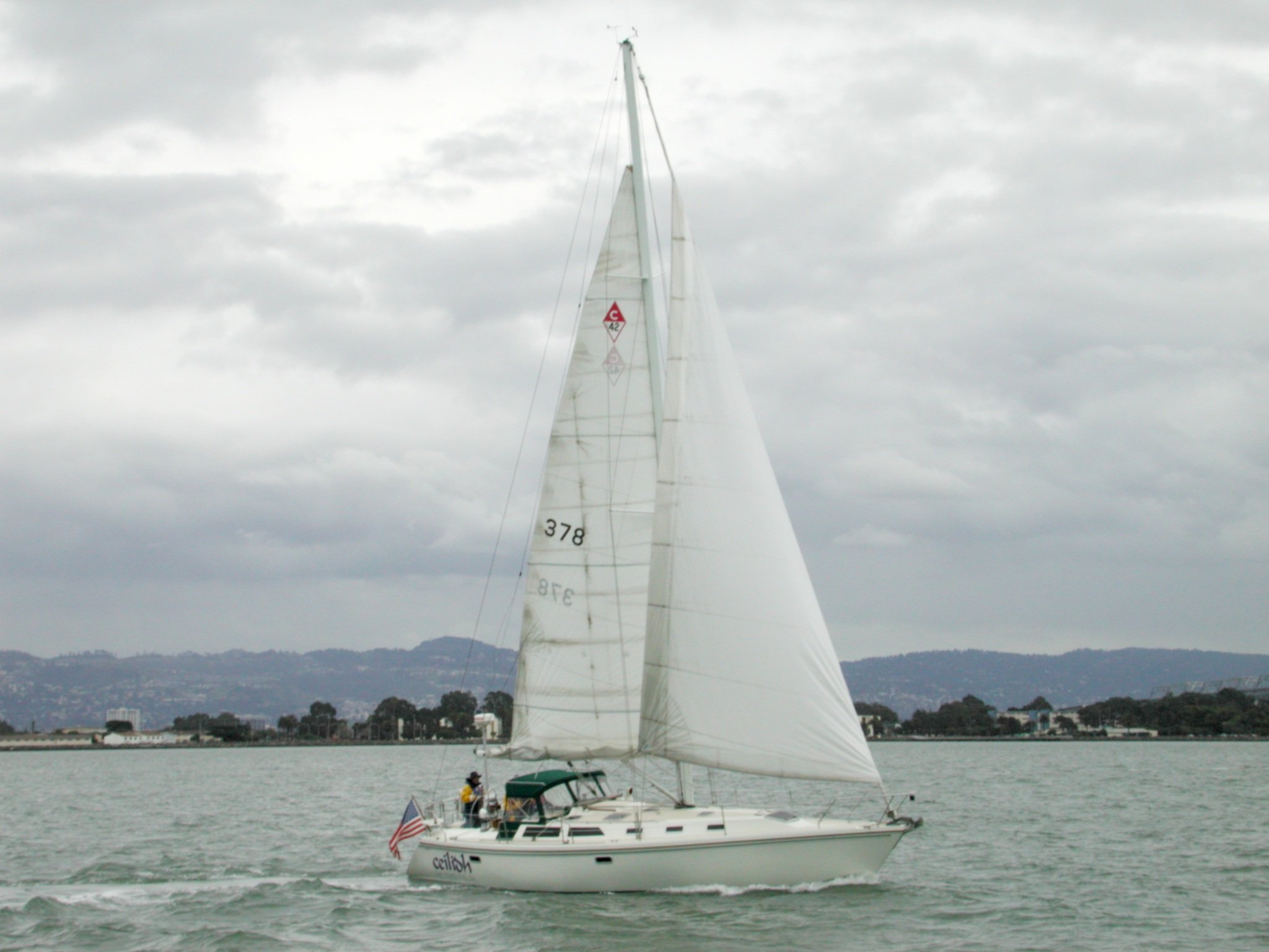 Ceilidh Hope and Richard's Catalina 42, on her first sail with her new name. Off SF