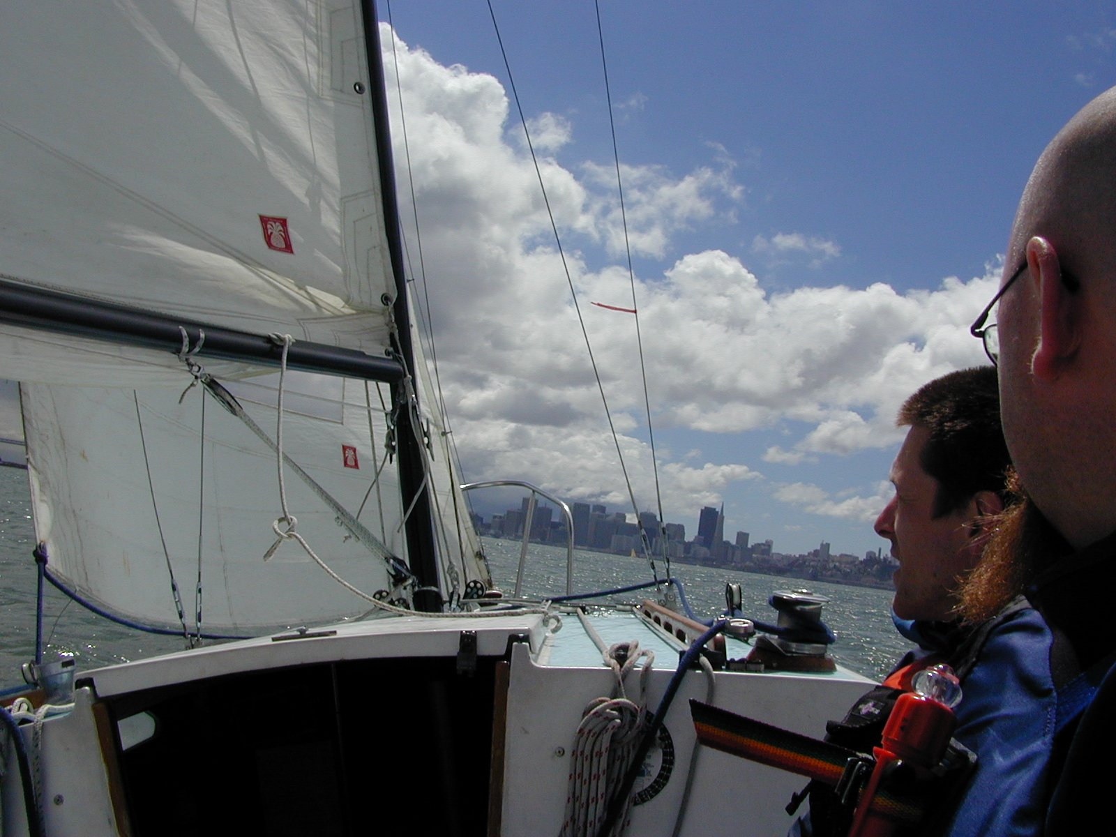Clint and Brian sailing to SF NW of Treasure Island (SF Bay)