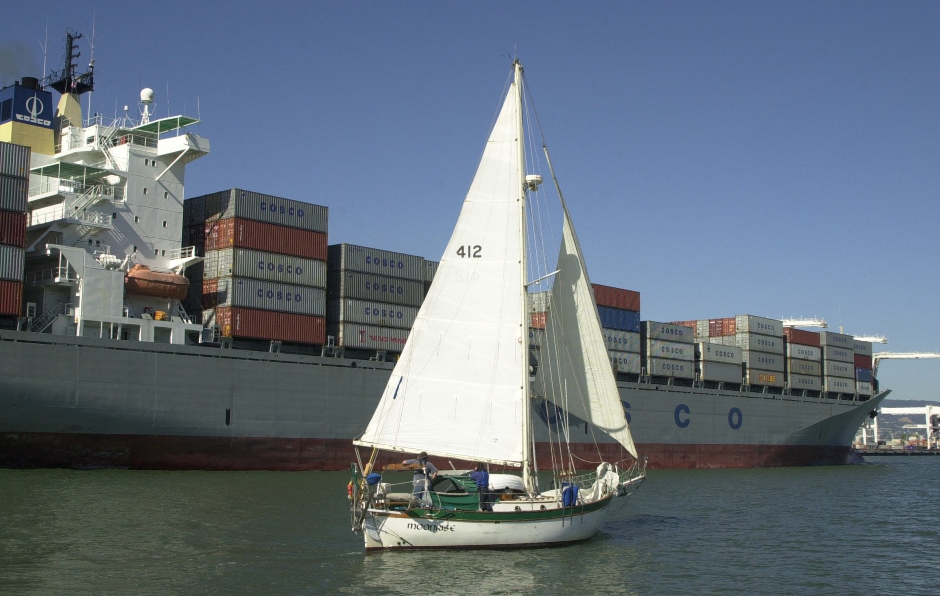 Moonrise in the estuary Clint and Paola, in Moonrise, passing freighter Minhe. As seen in Latitude 38 (January 2002). The Oakland Estuary