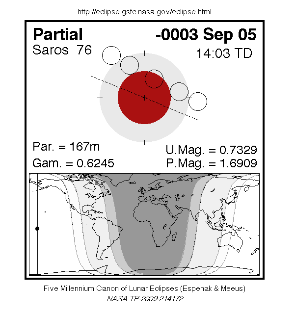 A partial eclipse of the Moon occurred on 5 September, 0004 BC UT Old Style, with maximum eclipse at 11:07 UT. The Moon was strikingly shadowed in this deep partial eclipse which lasted 2 hours and 48 minutes, with 73% of the Moon in darkness at maximum.