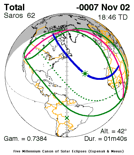 A total eclipse of the Sun occurred on 2 November, 0008 BC UT Old Style, with maximum eclipse at 15:49 UT. The Sun was darkened for 1 minute and 40 seconds by a dramatic total eclipse covering a path up to 96 km wide. This was a sight worth seeing.