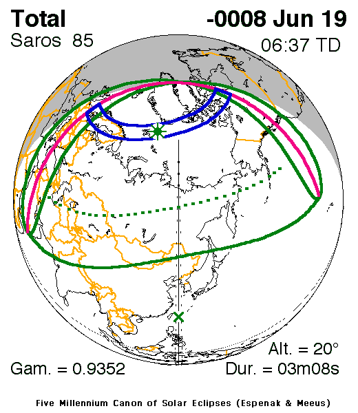 A total eclipse of the Sun occurred on 19 June, 0009 BC UT Old Style, with maximum eclipse at 03:39 UT. A dramatic total eclipse plunged the Sun into darkness for 3 minutes and 8 seconds at maximum, creating an amazing spectacle for observers in a very broad path, 573 km wide at maximum.