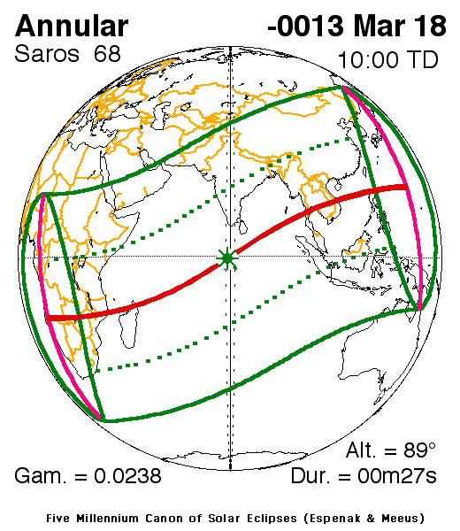 An annular eclipse of the Sun occurred on 18 March, 0014 BC UT Old Style, with maximum eclipse at 07:01 UT. A large annular eclipse covered over 99% of the Sun, creating a dramatic spectacle for observers in a narrow path at most 14 km wide; it lasted just 27 seconds at the point of maximum eclipse.