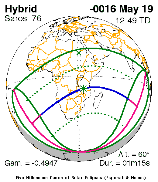 A hybrid eclipse of the Sun occurred on 19 May, 0017 BC UT Old Style, with maximum eclipse at 09:50 UT. The Sun was darkened for 1 minute and 15 seconds by a dramatic hybrid eclipse covering a narrow path at most 44 km wide. This was a sight worth seeing.