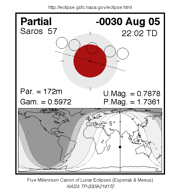 A partial eclipse of the Moon occurred on 5 August, 0031 BC UT Old Style, with maximum eclipse at 19:01 UT. The Moon was strikingly shadowed in this deep partial eclipse which lasted 2 hours and 52 minutes, with 79% of the Moon in darkness at maximum.