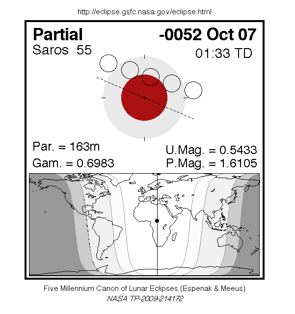 A partial eclipse of the Moon occurred on 6 October, 0053 BC UT Old Style, with maximum eclipse at 22:28 UT. The Earth's shadow on the moon was clearly visible in this eclipse, with 54% of the Moon in shadow; the partial eclipse lasted for 2 hours and 43 minutes.