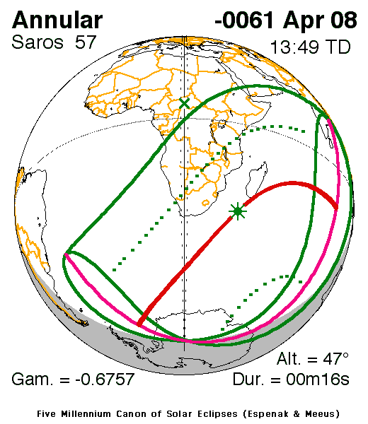 An annular eclipse of the Sun occurred on 8 April, 0062 BC UT Old Style, with maximum eclipse at 10:43 UT. A large annular eclipse covered over 99% of the Sun, creating a dramatic spectacle for observers in a narrow path at most 14 km wide; it lasted just 16 seconds at the point of maximum eclipse.