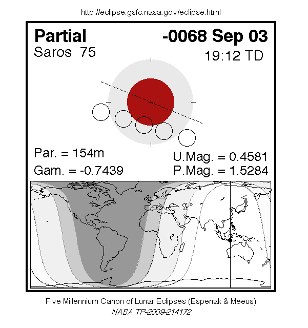 A partial eclipse of the Moon occurred on 3 September, 0069 BC UT Old Style, with maximum eclipse at 16:05 UT. The Earth's shadow on the moon was clearly visible in this eclipse, with 46% of the Moon in shadow; the partial eclipse lasted for 2 hours and 34 minutes.