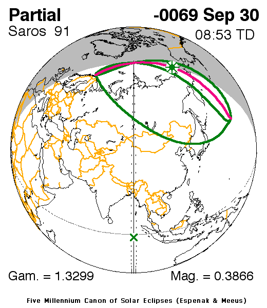 A partial eclipse of the Sun occurred on 30 September, 0070 BC UT Old Style, with maximum eclipse at 05:45 UT. A small partial eclipse barely darkened the Sun. With just 39% of the Sun covered for viewers closest to the center, this was of limited interest.