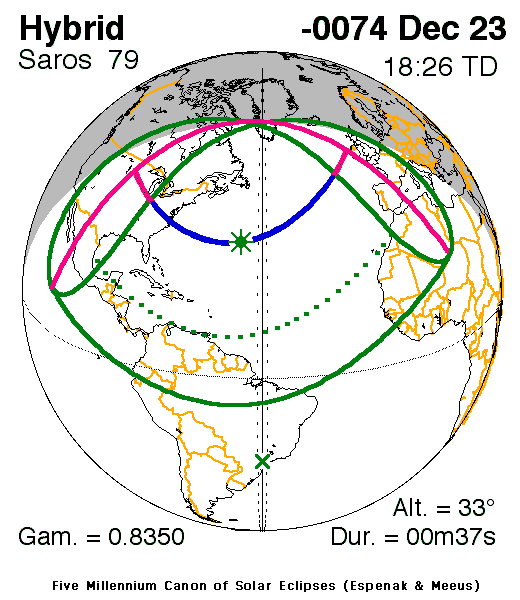 A hybrid eclipse of the Sun occurred on 23 December, 0075 BC UT Old Style, with maximum eclipse at 15:18 UT. A fleeting hybrid eclipse covered a narrow path at most 41 km wide and lasted for 37 seconds at the point of maximum eclipse.