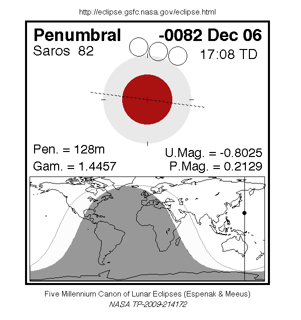 A penumbral eclipse of the Moon occurred on 6 December, 0083 BC UT Old Style, with maximum eclipse at 13:58 UT. This very subtle penumbral eclipse was essentially invisible to the naked eye; though it lasted 2 hours and 8 minutes, just 21% of the Moon's disc was in partial shadow (with no part of it in complete shadow).