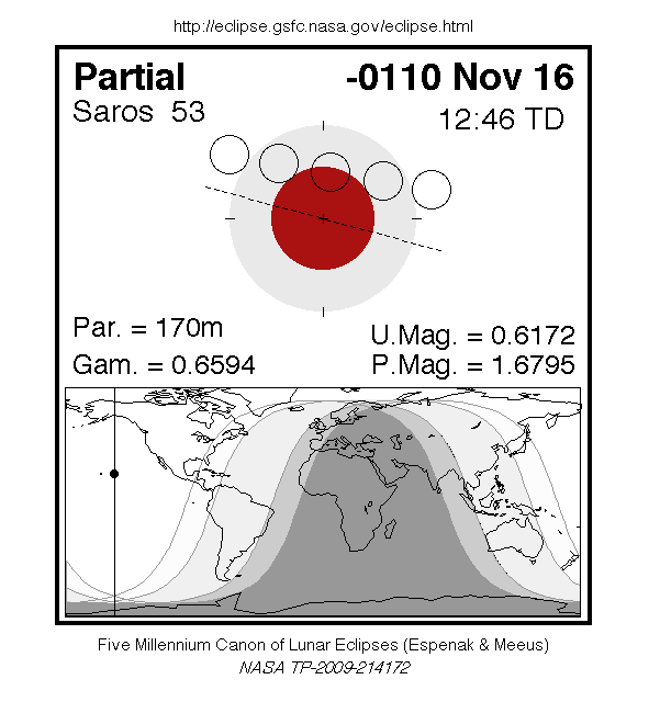 A partial eclipse of the Moon occurred on 16 November, 0111 BC UT Old Style, with maximum eclipse at 09:31 UT. The Moon was strikingly shadowed in this deep partial eclipse which lasted 2 hours and 50 minutes, with 62% of the Moon in darkness at maximum.