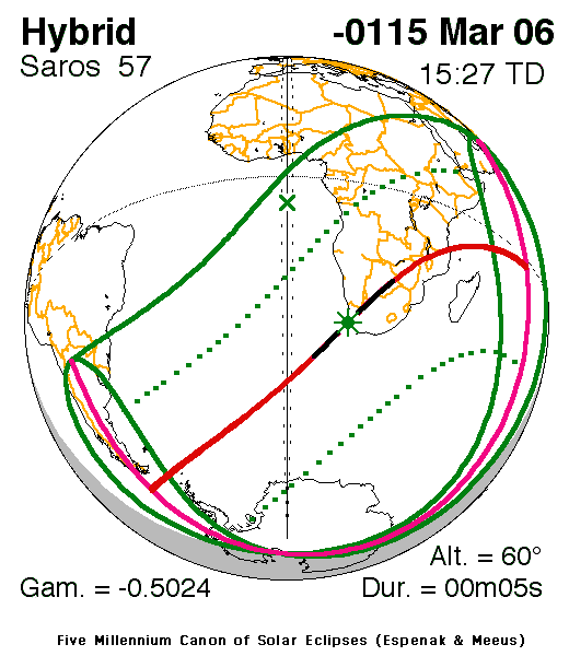 A hybrid eclipse of the Sun occurred on 6 March, 0116 BC UT Old Style, with maximum eclipse at 12:10 UT. A fleeting hybrid eclipse covered only a tiny path, just 4 km wide and lasted for a brief 5 seconds at the point of maximum eclipse.