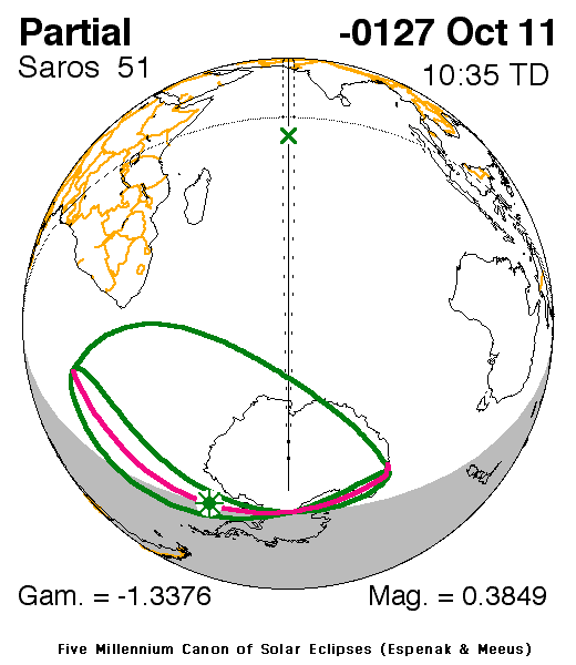 A partial eclipse of the Sun occurred on 11 October, 0128 BC UT Old Style, with maximum eclipse at 07:17 UT. A small partial eclipse barely darkened the Sun. With just 38% of the Sun covered for viewers closest to the center, this was of limited interest.