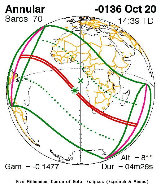 An annular eclipse of the Sun occurred on 20 October, 0137 BC UT Old Style, with maximum eclipse at 11:19 UT. The Sun was 96% covered in a moderate annular eclipse, lasting 4 minutes and 26 seconds and covering a path up to 157 km wide.