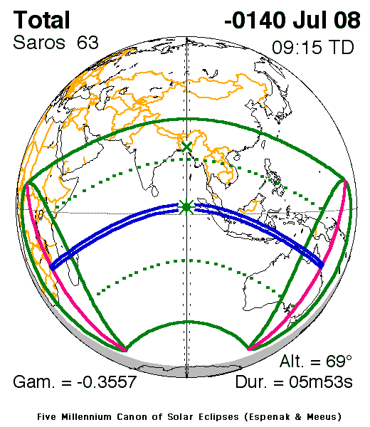 A total eclipse of the Sun occurred on 8 July, 0141 BC UT Old Style, with maximum eclipse at 05:54 UT. A dramatic total eclipse plunged the Sun into darkness for 5 minutes and 53 seconds at maximum, creating an amazing spectacle for observers in a broad path up to 209 km wide.