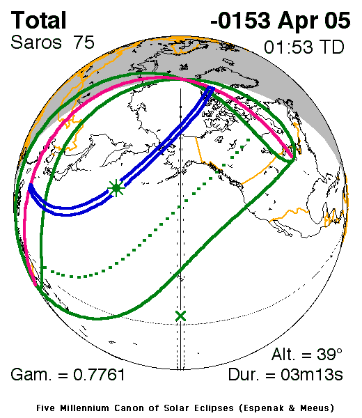 A total eclipse of the Sun occurred on 4 April, 0154 BC UT Old Style, with maximum eclipse at 22:30 UT. A dramatic total eclipse plunged the Sun into darkness for 3 minutes and 13 seconds at maximum, creating an amazing spectacle for observers in a very broad path, 240 km wide at maximum.