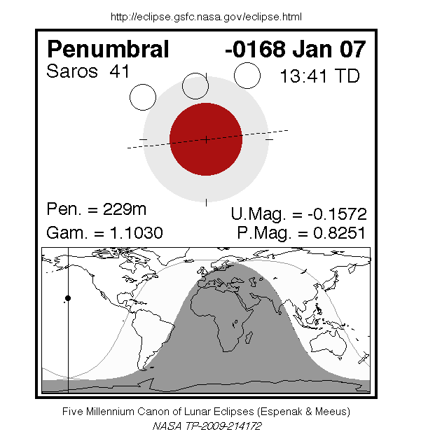 A penumbral eclipse of the Moon occurred on 7 January, 0169 BC UT Old Style, with maximum eclipse at 10:15 UT. This subtle penumbral eclipse may have been visible to a skilled observer at maximum eclipse. 83% of the Moon's disc was partially shaded by the Earth (none of it was in total shadow), which caused a gentle shadow gradient across its disc at maximum; the eclipse as a whole lasted 3 hours and 49 minutes.