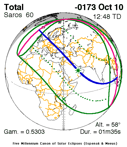 A total eclipse of the Sun occurred on 10 October, 0174 BC UT Old Style, with maximum eclipse at 09:21 UT. The Sun was darkened for 1 minute and 35 seconds by a dramatic total eclipse covering a narrow path at most 73 km wide. This was a sight worth seeing.