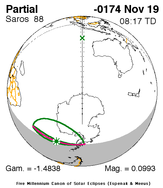 A partial eclipse of the Sun occurred on 19 November, 0175 BC UT Old Style, with maximum eclipse at 04:50 UT. With only 10% of the Sun covered at maximum eclipse, this was a very marginal eclipse at best, and rather uninteresting.