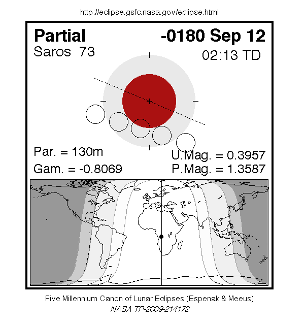 A partial eclipse of the Moon occurred on 11 September, 0181 BC UT Old Style, with maximum eclipse at 22:45 UT. The Earth's shadow on the moon was clearly visible in this eclipse, with 40% of the Moon in shadow; the partial eclipse lasted for 2 hours and 10 minutes.