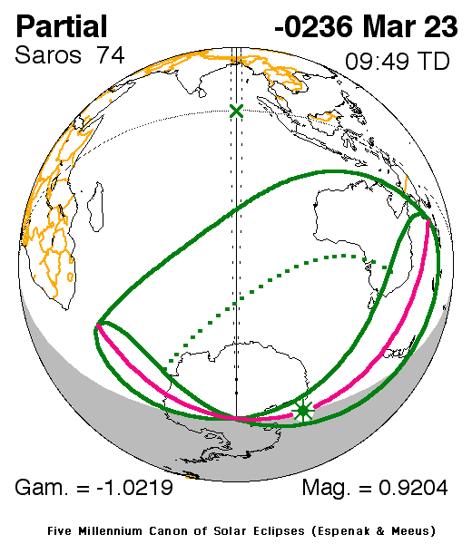 A partial eclipse of the Sun occurred on 23 March, 0237 BC UT Old Style, with maximum eclipse at 06:09 UT. This was a deep partial eclipse, with 92% of the Sun covered for viewers closest to the center. This provided a significant spectacle for those who saw it.