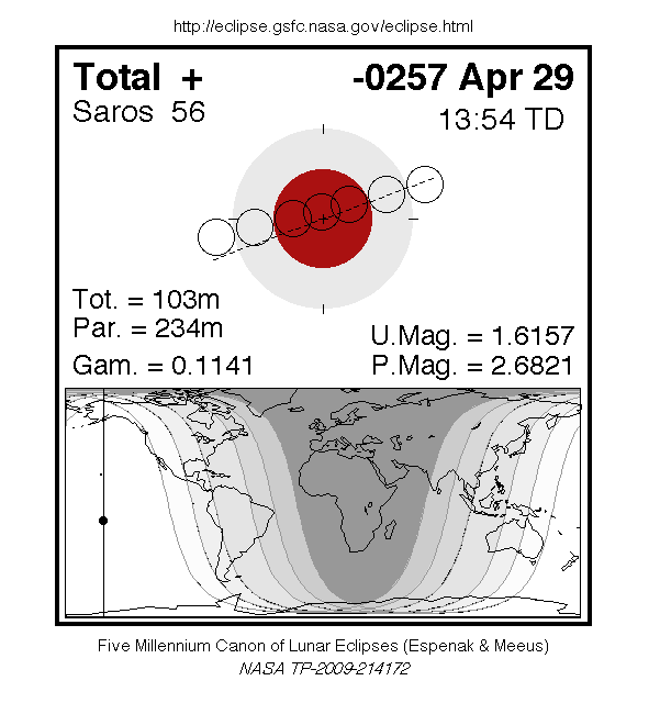 A total eclipse of the Moon occurred on 29 April, 0258 BC UT Old Style, with maximum eclipse at 10:10 UT. A dramatic total eclipse lasting 1 hour and 43 minutes plunged the full Moon into deep darkness, as it passed right through the centre of the Earth's umbral shadow. While the visual effect of a total eclipse is variable, the Moon may have been stained a deep orange or red colour at maximum eclipse. This was a great spectacle for everyone who saw it. The partial eclipse lasted for 3 hours and 54 minutes in total.