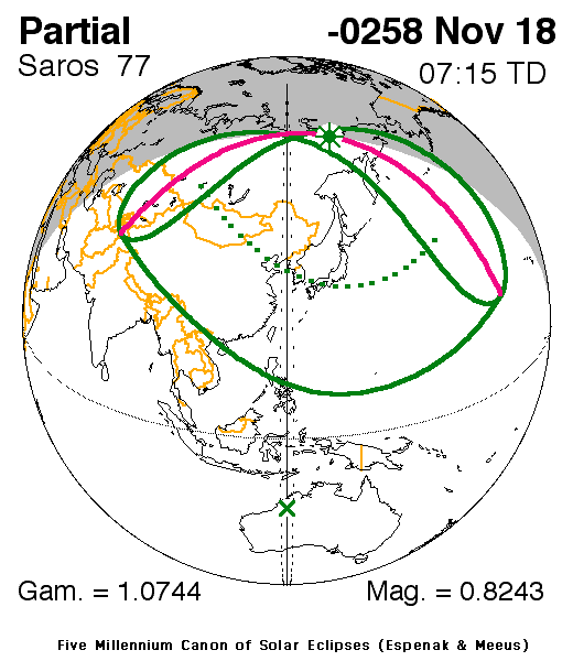 A partial eclipse of the Sun occurred on 18 November, 0259 BC UT Old Style, with maximum eclipse at 03:30 UT. This was a deep partial eclipse, with 82% of the Sun covered for viewers closest to the center. This provided a significant spectacle for those who saw it.