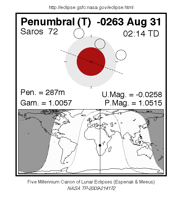 A penumbral eclipse of the Moon occurred on 30 August, 0264 BC UT Old Style, with maximum eclipse at 22:28 UT. In a rare total penumbral eclipse, the entire Moon was partially shaded by the Earth (though none of it was in complete shadow), and the shading across the Moon should have been quite visible at maximum eclipse. The penumbral phase lasted for 4 hours and 47 minutes in all, though for most of it, the eclipse was extremely difficult or impossible to see.