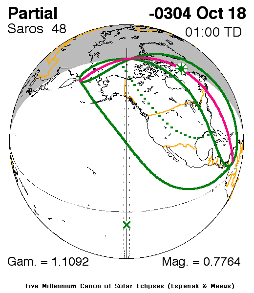 A partial eclipse of the Sun occurred on 17 October, 0305 BC UT Old Style, with maximum eclipse at 21:05 UT. A moderate partial eclipse, with 78% of the Sun covered for viewers closest to the center, created an interesting spectacle.