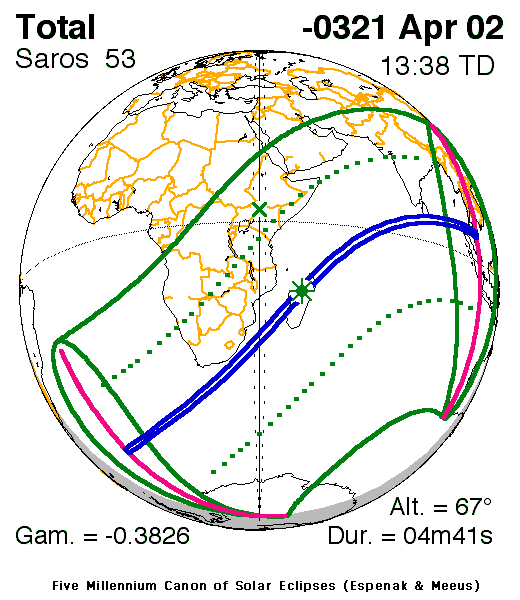 A total eclipse of the Sun occurred on 2 April, 0322 BC UT Old Style, with maximum eclipse at 09:40 UT. A dramatic total eclipse plunged the Sun into darkness for 4 minutes and 41 seconds at maximum, creating an amazing spectacle for observers in a broad path up to 202 km wide.