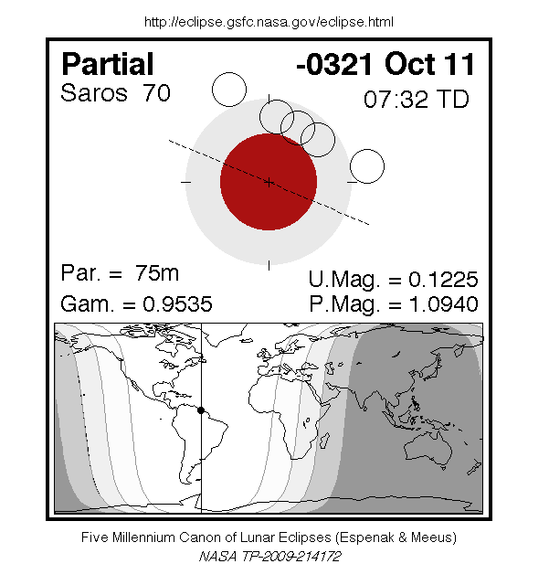 A partial eclipse of the Moon occurred on 11 October, 0322 BC UT Old Style, with maximum eclipse at 03:34 UT. At maximum eclipse, a small bite out of the Moon should have been visible. The eclipse lasted for 1 hour and 15 minutes, with just 12% of the Moon in shadow at maximum.